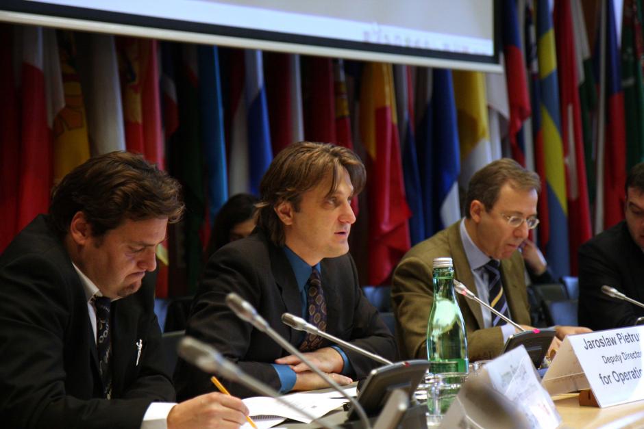 Jaroslaw Pietrusiewicz, Deputy Director for Operations Service, speaks at an OSCE Border Security and Management meeting. To the right is Dionyssios Kyvetos, Minister Plenipotentiary in the Permanent Mission of Greece to the OSCE. Vienna, 4 November 2009.