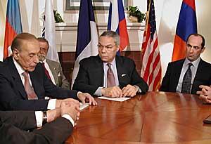 United States Secretary of State Colin Powell (centre) mediates talks