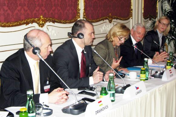 R-L: Eva Biaudet, OSCE Special Representative; William Lacy Swing, IOM Director General; Maria Fekter, Austrian Interior Ministry; Ivan Langer, Czech Interior Minister; Tibor Draskovics, Hungarian Justice Minister at a trafficking conference, 23 Feb 2009.