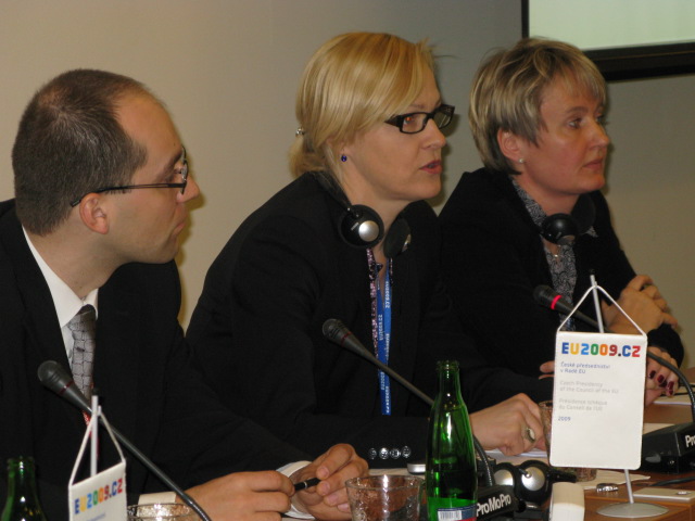 Eva Biaudet (c), OSCE Special Representative on combating trafficking; Martin Linhart (l) of the Czech Interior Ministry, and Swedish National Rapporteur Kajsa Wahlberg (r), at a conference of EU national trafficking rapporteurs, Prague, 30 March 2009.