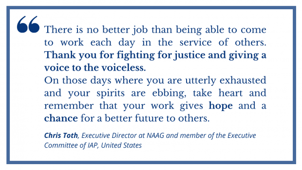 The Executive Director of the National Association of Attorneys General (NAAG) and IAP Executive Committee Member, Chris Toth, highlighted that international co-operation is crucial in fighting transnational crimes like human trafficking, “so this type of collaboration, this type of relationship building, is extremely important, to becoming more effective at ending human trafficking”.