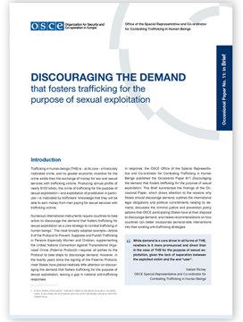 This Brief summarizes the findings of Occasional Paper No. 11 Discouraging the demand that fosters trafficking for the purpose of sexual exploitation, which draws attention to the reasons why States should discourage demand; outlines the international legal obligations and political commitments relating to demand; discusses the criminal justice and prevention policy options that OSCE participating States have at their disposal to discourage demand; and makes recommendations on how countries can better incorporate demand-side interventions into their existing anti-trafficking strategies.