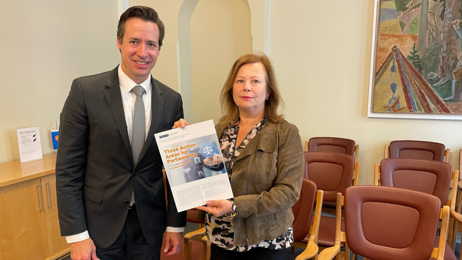OSCE Special Representative and Co-ordinator for Combating Trafficking in Human Beings, Valiant Richey, handed over the brochure "Three Action Areas for Parliaments to Combat Trafficking in Human Beings" to the Member of Parliament of Norway Siv Mossleth, Oslo, 8 September 2022 (Julie Helmersberg Brevik)