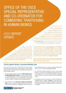 This Report Update provides a short overview of the core values and unique methodology of the OSCE Office of the Special Representative and Co-ordinator for Combating Trafficking in Human Beings, a recap of its projects and activities in 2022, and a preview of priority areas for 2023.