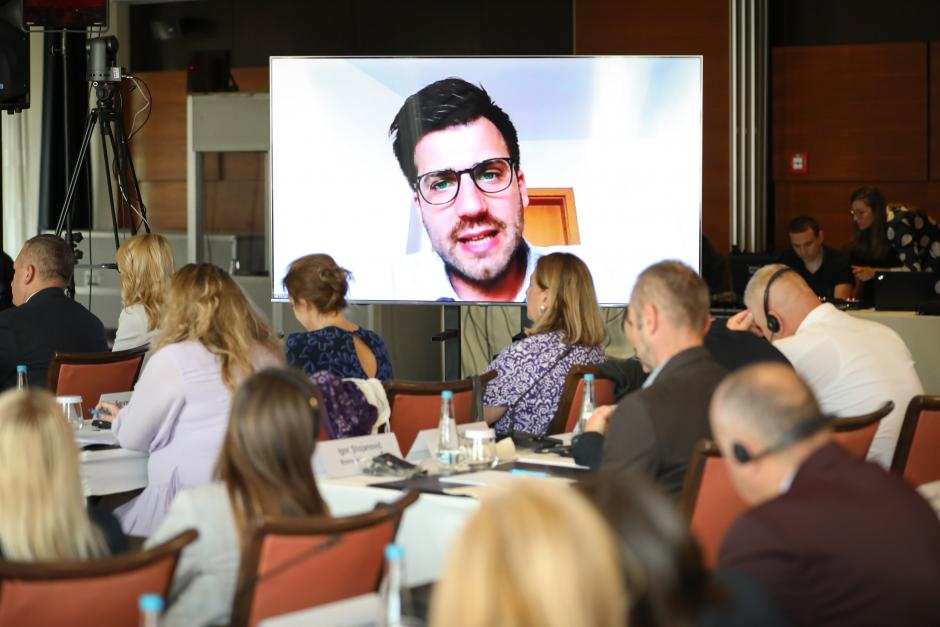 Acting OSCE Coordinator for Combating Trafficking in Human Beings Andrea Salvoni opening the roundtable "Strengthening the role of the private sector and financial institutions in detecting and preventing trafficking in human beings," Sarajevo, 7 September 2023