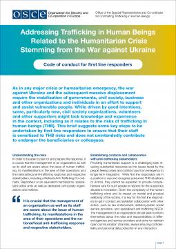 First-line responders are the first point of contact and information for people requiring assistance in migration and humanitarian crises. While driven by good intentions, some, particularly new civil society organizations, volunteers, and other supporters, might lack knowledge and experience in the context, including as it relates to the risks of trafficking in human beings. To address this gap, the Office of the OSCE Special Representative and Co-ordinator for Combating Trafficking in Human Beings developed a Code of Conduct that suggests some key steps to be undertaken by first-line responders to ensure that their staff is sensitized to the risks of human trafficking and does not unintendedly contribute to endangering the beneficiaries or colleagues.
