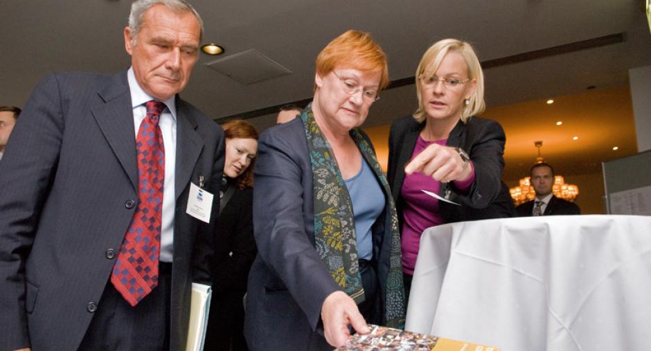 Pietro Grasso (left), Italian Chief Anti-Mafia Prosecutor; Tarja Halonen, President of the Republic of Finland; and Eva Biaudet (right), OSCE Special Representative, at a conference in Helsinki on the prosecution of trafficking cases, 10 September 2008. (OSCE/Petri Krook)