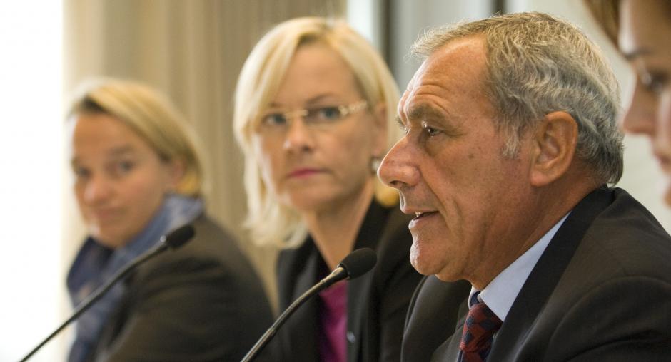 Tuija Brax (left), Finnish Minister of Justice; Eva Biaudet (centre), OSCE Special Representative; and Pietro Grasso (right), Chief Prosecutor of the Italian National Anti-Mafia Bureau, during a press conference in Helsinki, 10 September 2008. (OSCE/Petri Krook)