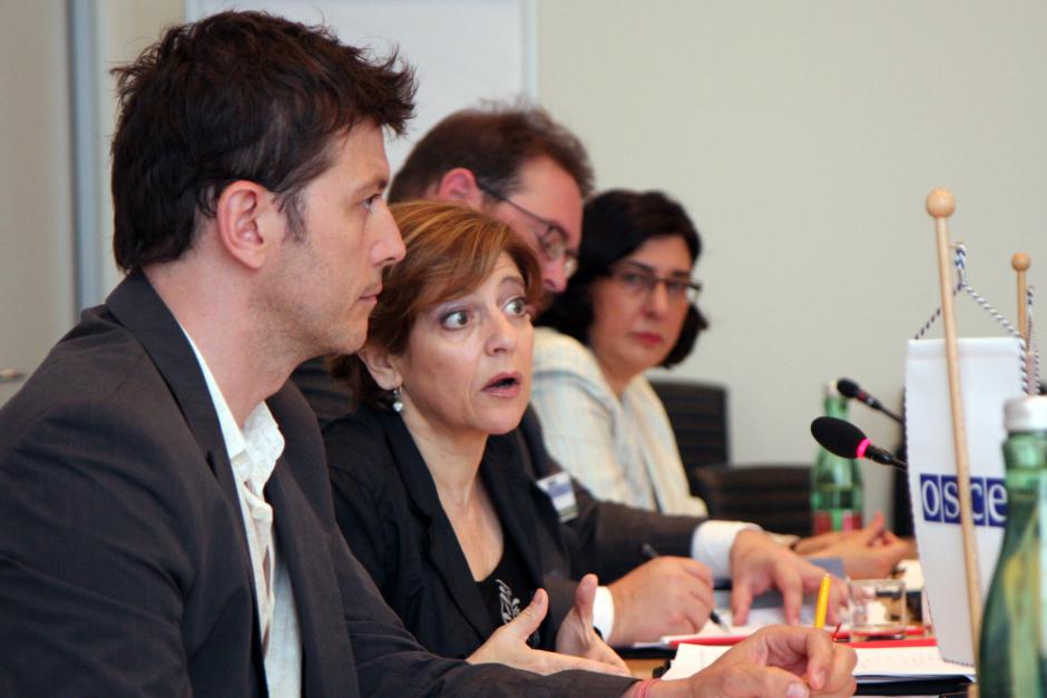OSCE Special Representative and Co-ordinator for Combating Trafficking in Human Beings, Maria Grazia Giammarinaro (c), speaks at a press conference during the 10th Alliance against Trafficking in Persons Conference, Vienna, 18 June 2010.