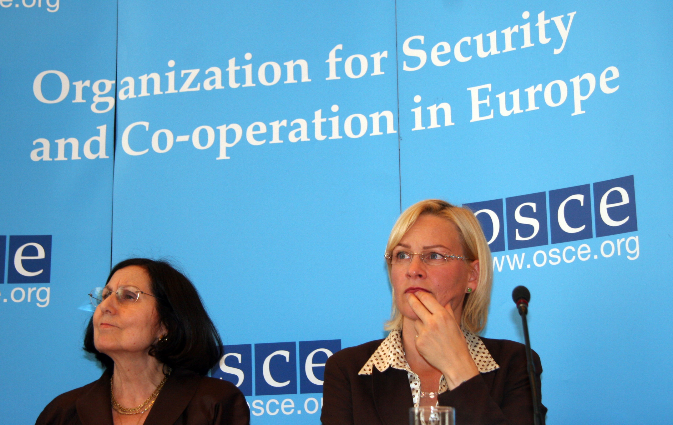 Ambassador Silvia Escobar (left) of Spain and Eva Biaudet, the OSCE Special Representative and Co-ordinator for Combating Human Trafficking, at a news conference in Vienna, 11 September 2007.