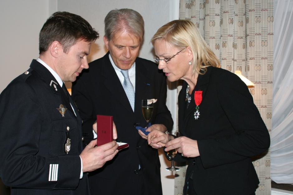 OSCE Special Representative on combating human trafficking Eva Biaudet (r) wearing the Légion d'honneur presented to her by French Ambassador to the OSCE, Eric Lebédel (c) and Advisor for Security Affairs, Guillaume Le Blond, Vienna, 30 October 2008.