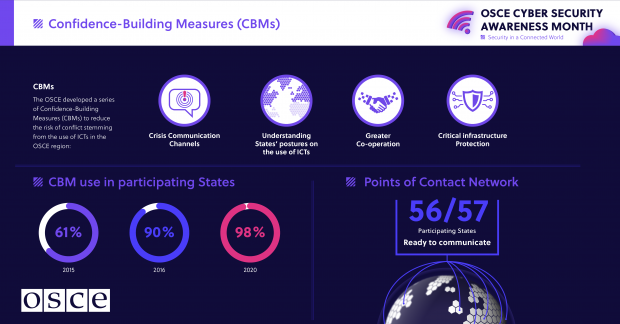 The key instrument within the OSCE’s toolbox to reduce the risks of inter-State conflict in cyberspace are the 16 ground-breaking Confidence Building Measures (CBMs) that the Organization’s 57 participating States have agreed on in recent years. They are designed to enhance transparency and build trust among States through communication and dialogue.
