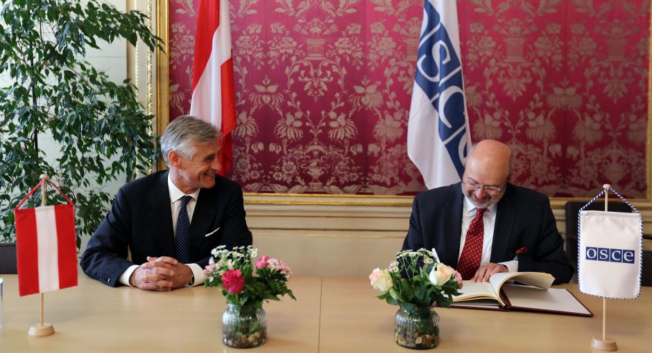 Generalsekretär Michael Linhart und OSZE-Generalsekretär Lamberto Zannier (r) unterzeichnen das OSZE-Amtssitzabkommen in Wien, 14 Juni 2017.