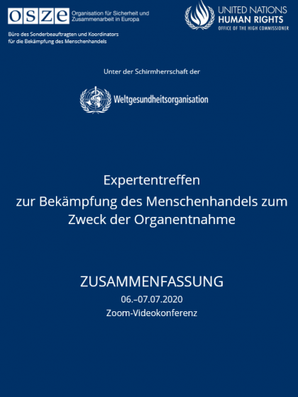 Zusammenfassung des Expertentreffen zur Bekämpfung des Menschenhandels zum Zweck der Organentnahme, das vom Büro des Sonderbeauftragten und Koordinators der OSZE für die Bekämpfung des Menschenhandels und dem Amt des UN Hochkommissars für Menschenrechte (OHCHR), vom 6.bis 7. Juli 2020 gemeinsam organisiert wurde. Die Veranstaltung fand unter anderem unter der Schirmherrschaft der Weltgesundheitsorganisation (WHO) statt.