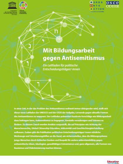 In einer Zeit, in der das Problem des Antisemitismus weltweit immer drängender wird, stellt sich dieser neue Leitfaden der UNESCO und der OSZE der Aufgabe, Lernende gegen aktuelle Formen des Antisemitismus zu wappnen. Der Leitfaden präsentiert konkrete Vorschläge wie Bildungsarbeit dazu beitragen kann, Antisemitismus zu begegnen, Voruteile vorzubeugen und Toleranz zu fördern. Zu diesem Zweck werden Ansätze vorgestellt, die auf Prinzipien wie Achtung der Menschenrechte, Global Citizenship Education, Inklusivität und Geschlechtergleichstellung aufbauen. Zudem gibt die Publikation politischen Entscheidungsträger/-innen nützliche Werkzeuge und Orientierungshilfen an die Hand, um sicherzustellen, dass die Bildungssysteme junge Menschen durch kritisches Denken und Respekt für andere widerstandsfähig gegen antisemitische Ideen, Ideologien, gewalttätigen Extremismus und, ganz allgemein, alle Formen von Rassismus und Diskriminierung machen können.