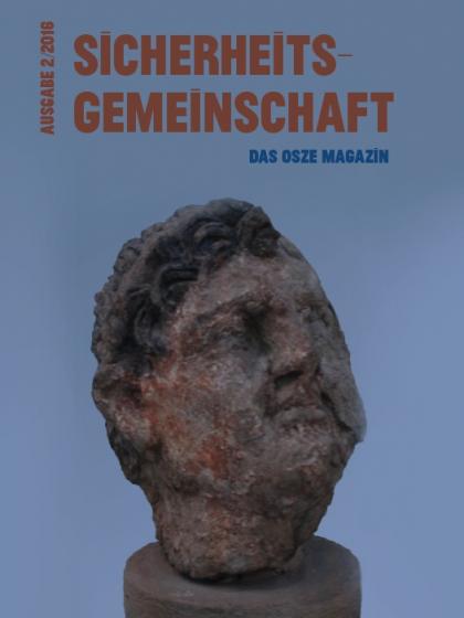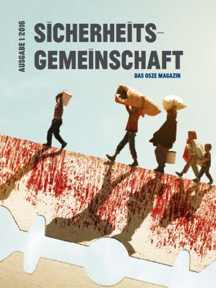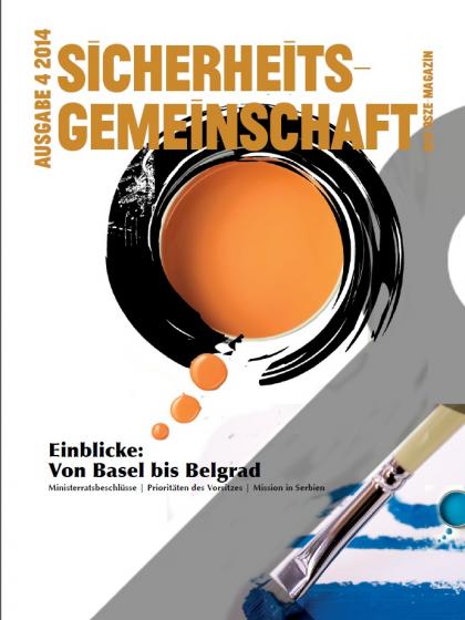 Sicherheitsgemeinschaft, die Zeitschrift der OSZE. Diskussion, Analyse und Informationen zu OSZE-bezogenen Sicherheitsfragen. Erscheint vierteljährlich auf Englisch, Französisch, Deutsch, Italienisch, Russisch und Spanisch. Titelbild von Cristiano De Matteis.