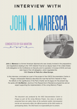 John J. Maresca is a former American diplomat who was closely involved in the preparations and negotiations leading to the 1975 Helsinki Final Act as deputy head of the United States (US) delegation to the Conference on Security and Co-operation in Europe (CSCE) and was later head of the US delegation which negotiated the 1990 Charter of Paris for a New Europe. In this interview, concluded as a part of the project of the OSCE Documentation Centre in Prague, Ambassador Maresca describes the road that led from Helsinki to Paris. He reflects on the significance of the Paris Charter and its legacy for the present day. He spoke with Ida Manton, alumna of the Researcher-in-Residence programme and an expert supporting the implementation of the Living Memory Project.