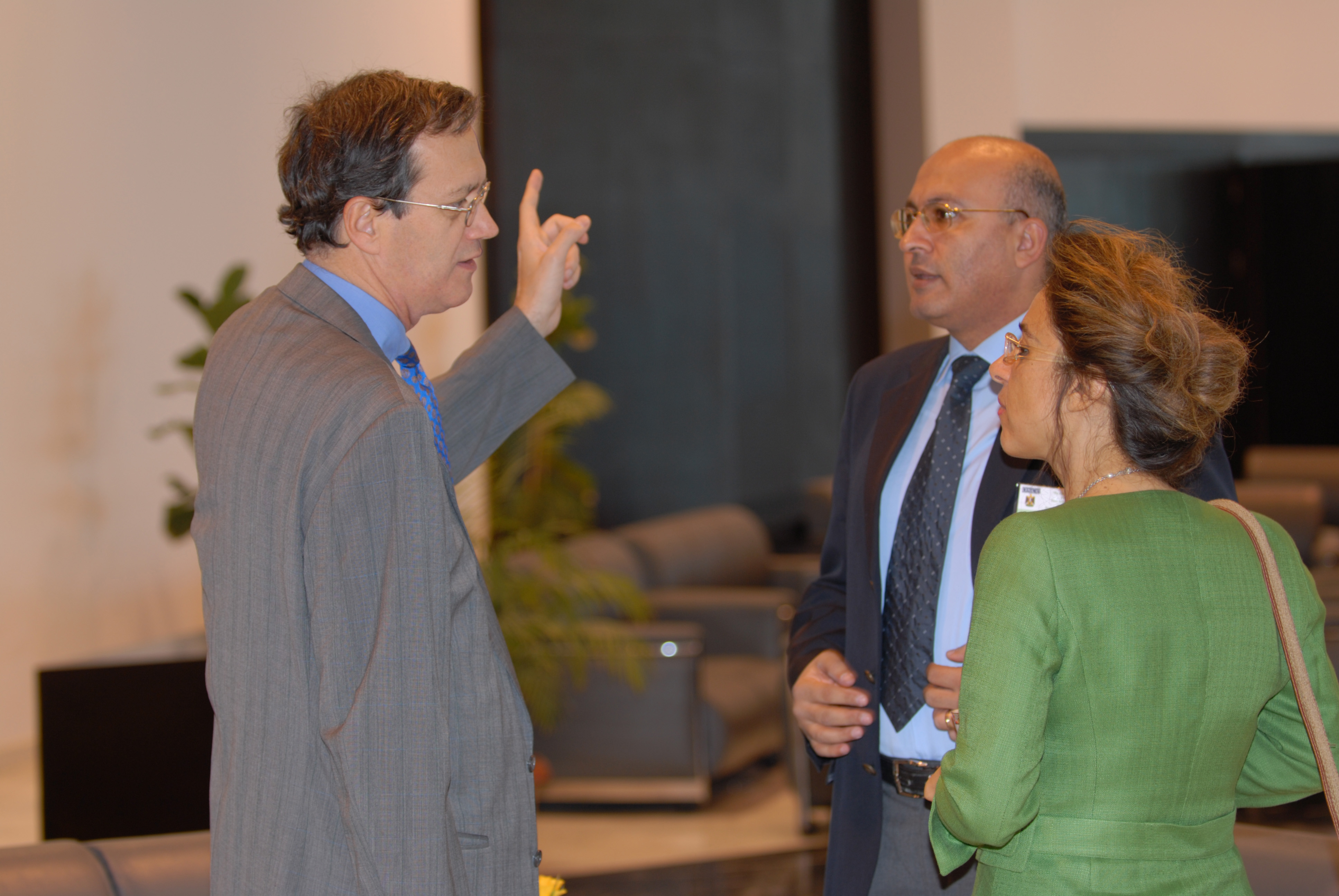 From left: OSCE Secretary General Marc Perrin de Brichambaut speaks with Tareq Mahmoud from Middle East News Agency and Dr. Magda Safwat Baraka from the Egyptian Foreign Ministry at the 2006 OSCE Mediterranean Seminar in Sharm El-Sheik, 6 November 2006.