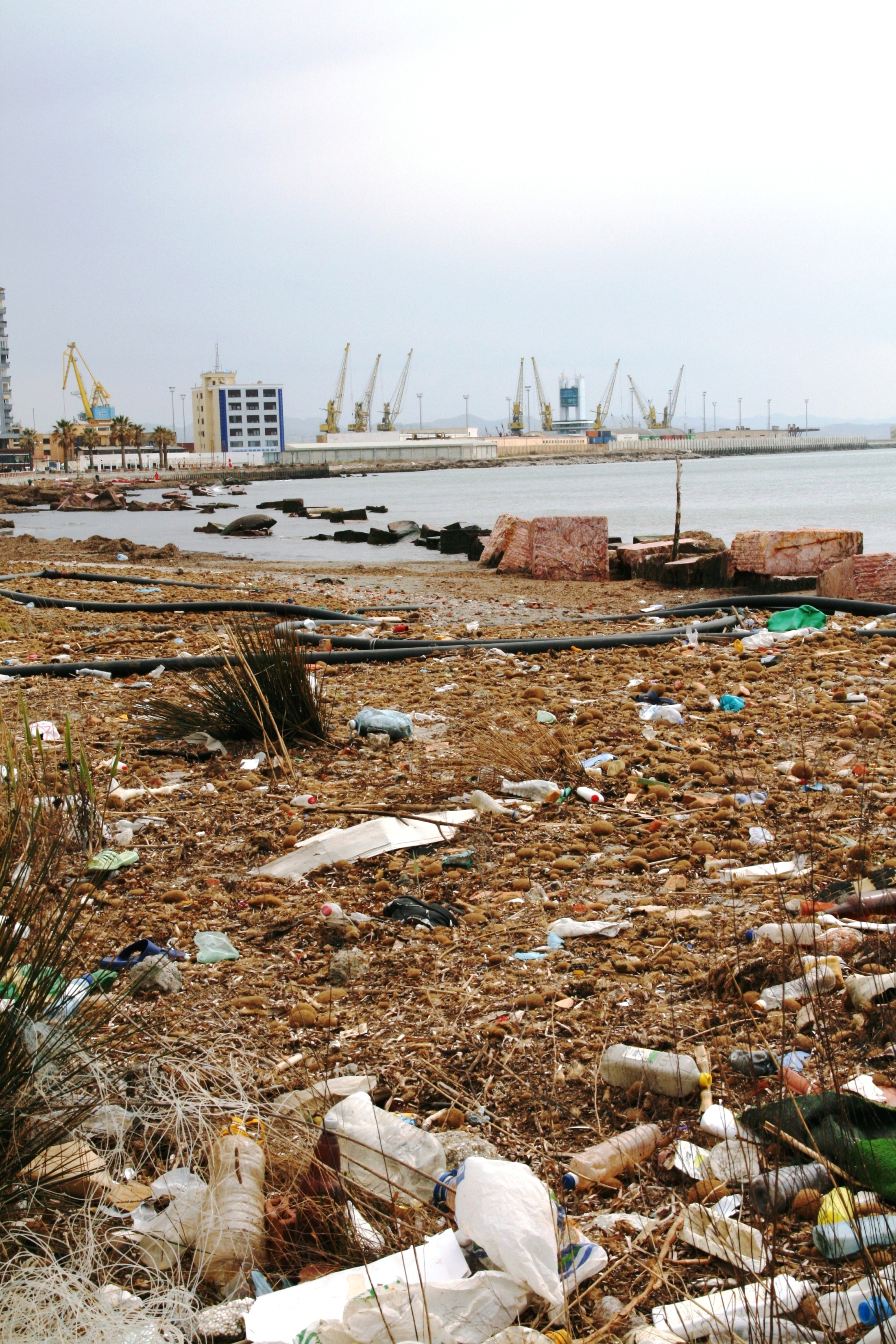 Plastic waste polluting the shores of the harbour city of Durres, Albania, March 2009