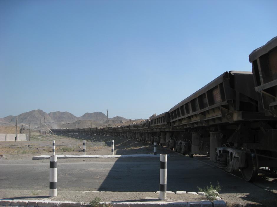 A freight train in Turkmenistan, 2 July 2009. Turkmenistan is an important country along the trans-Caspian railway routes.