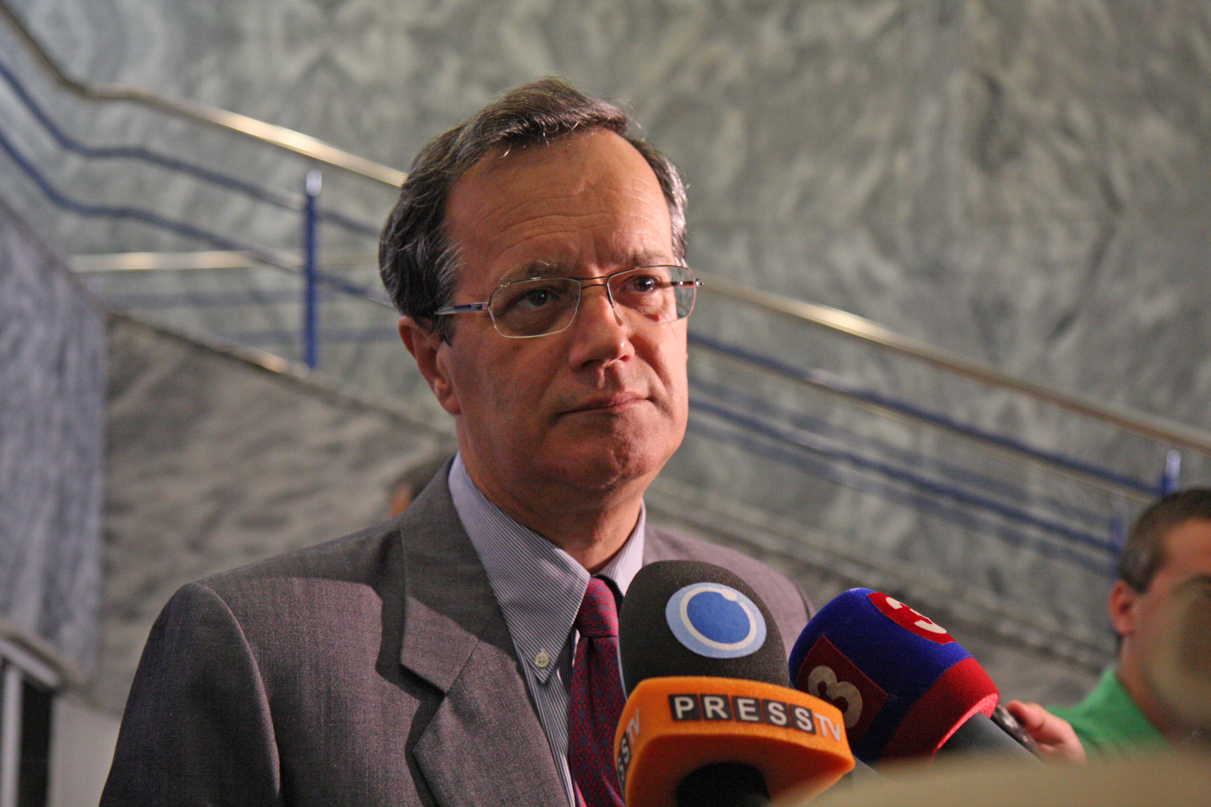 OSCE Secretary General Marc Perrin de Brichambaut speaks to journalists during an OSCE conference on strengthening energy security in the OSCE area, Bratislava, 6 July 2009.