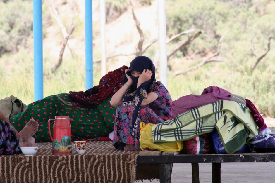 A young Turkmen girl covers her face to protect herself from heat and dust near a salt lake in Balkanabat, Turkmenistan, 30 June 2009.