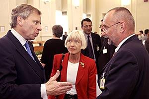 The OSCE Chairman-in-Office Jaap de Hoop Scheffer (left) and Czech Vice Premier Petr Mares (right) at the 11th OSCE Economic Forum in Prague, 20 May 2003.