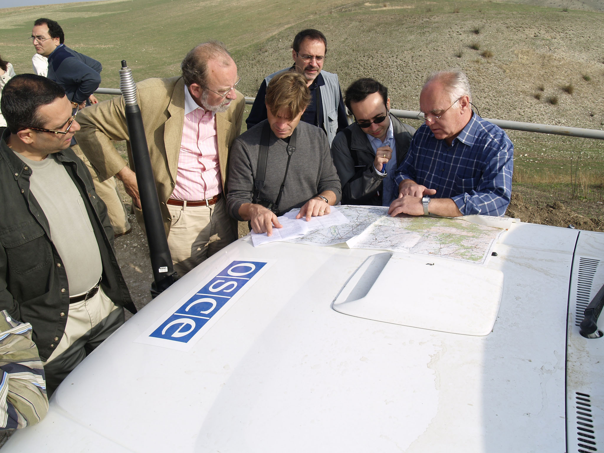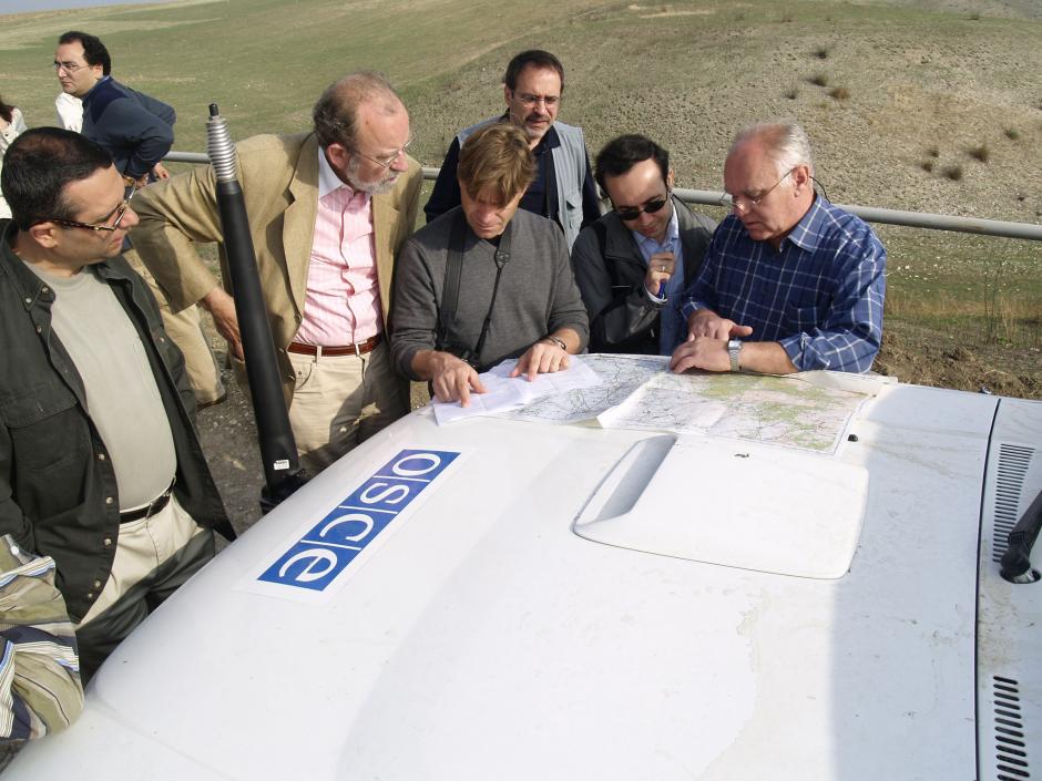Experts examine a map of the area during an OSCE-led mission in and around Nagorno-Karabakh to assess the environmental impact of fires in the region, in October 2006.