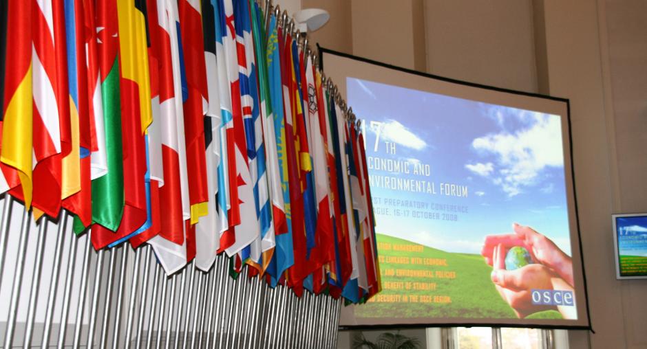 Flags of OSCE member states with the banner of the First Preparatory Conference of the 17th Economic and Environmental Forum, Prague, 16 October 2008 (OSCE/Martina Gadotti) Photo details