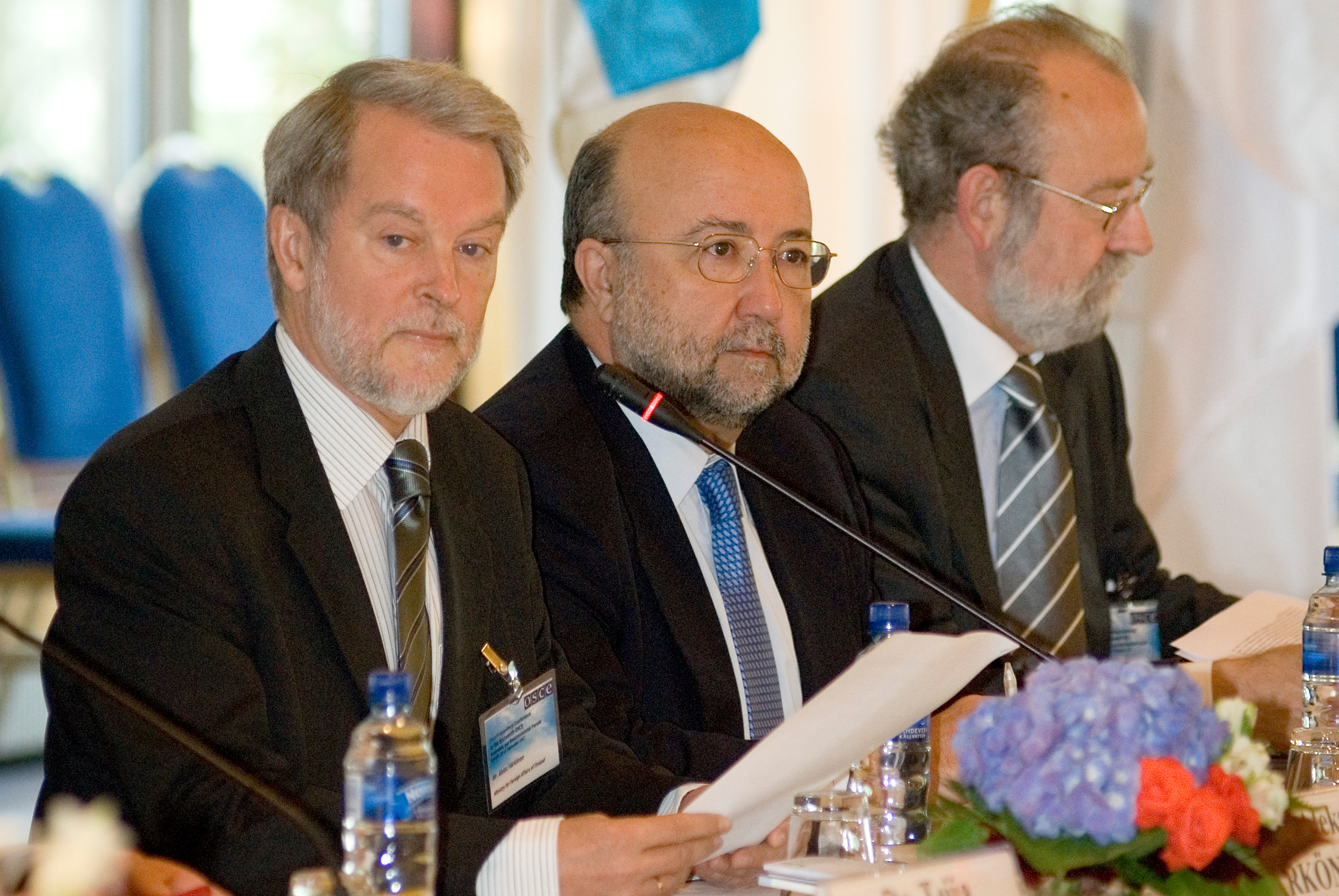 L-r: Amb. Aleksi Harkonen, Head of the Finnish OSCE Task Force, Amb. Jose Angel Lopez-Jorrin, Head of the Spanish OSCE Chairmanship Task Force, and Bernard Snoy, Co-ordinator of OSCE Economic and Environmental Affairs, in Helsinki, 10 September 2007.