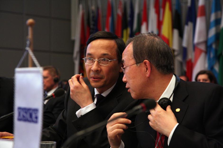 El Presidente del Consejo Permanente de la OSCE, Embajador Kairat Abdrakhmanov, y el Secretario General de las Naciones Unidas, Ban Ki-Moon, en una reunión del Consejo Permanente de la OSCE. Viena, 8 de abril de 2010.