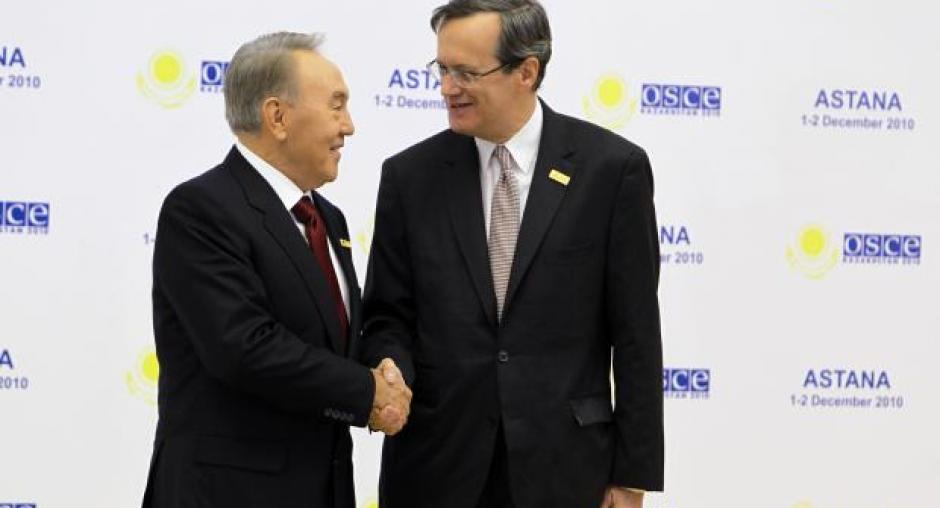 El Presidente de Kazajstán, Nursultan Nazarbayev, da la bienvenida a los altos mandatarios que han asistido a la Cumbre de la OSCE.
