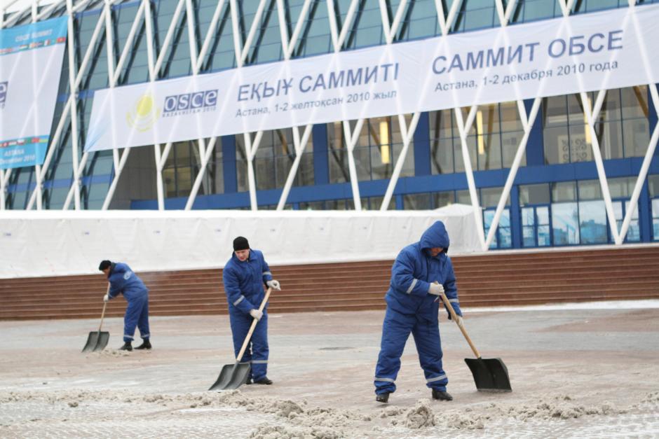 Trabajadores retirando nieve en el exterior del Palacio de la Independencia, Astana, 28 de noviembre de 2010.