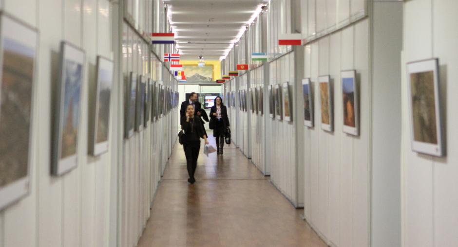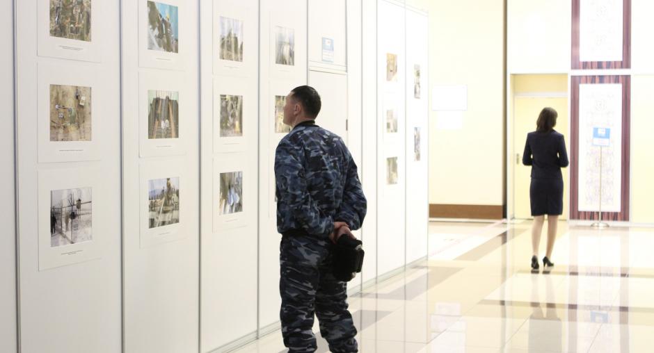 Un miembro del personal de seguridad echando un vistazo a una exposición fotográfica Astana, 28 de noviembre de 2010. (OSCE/Jonathan Perfect)
