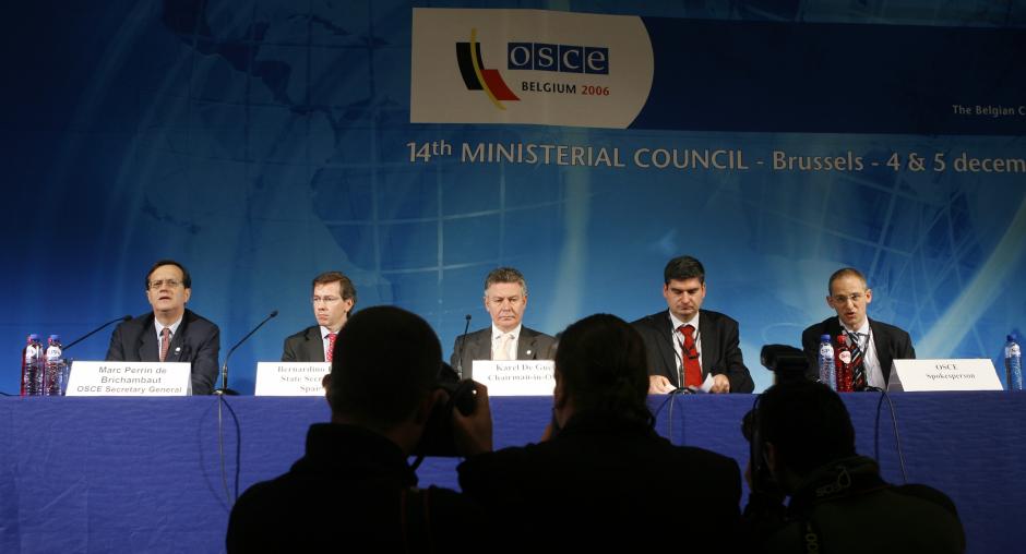 The final press conference with OSCE Chairman-in-Office Karel De Gucht (centre) at the end of the 14th OSCE Ministerial Council in Brussels, 5 December 2006. (Belga/Benoit Doppagne) Photo details
