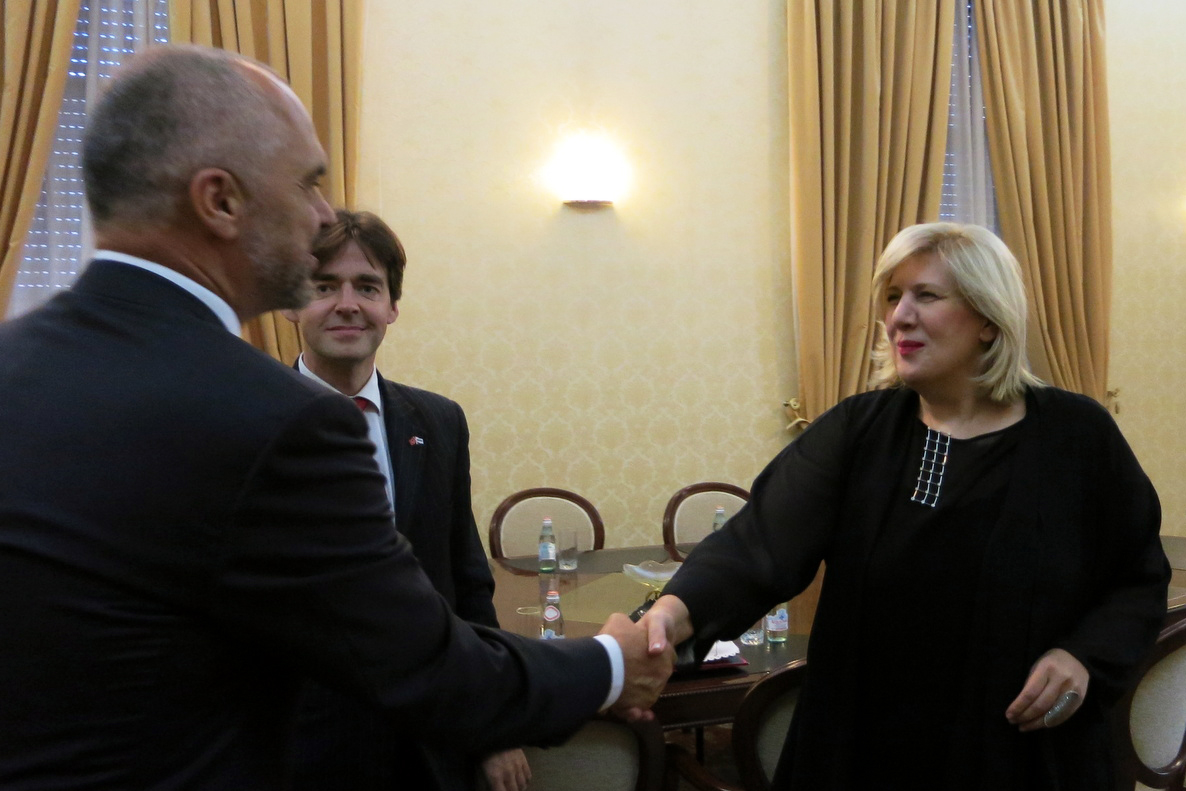 Albanian Prime Minister Edi Rama (l), in his first official meeting since taking office, greets OSCE Representative on Freedom of the Media Dunja Mijatović, 18 September 2013.