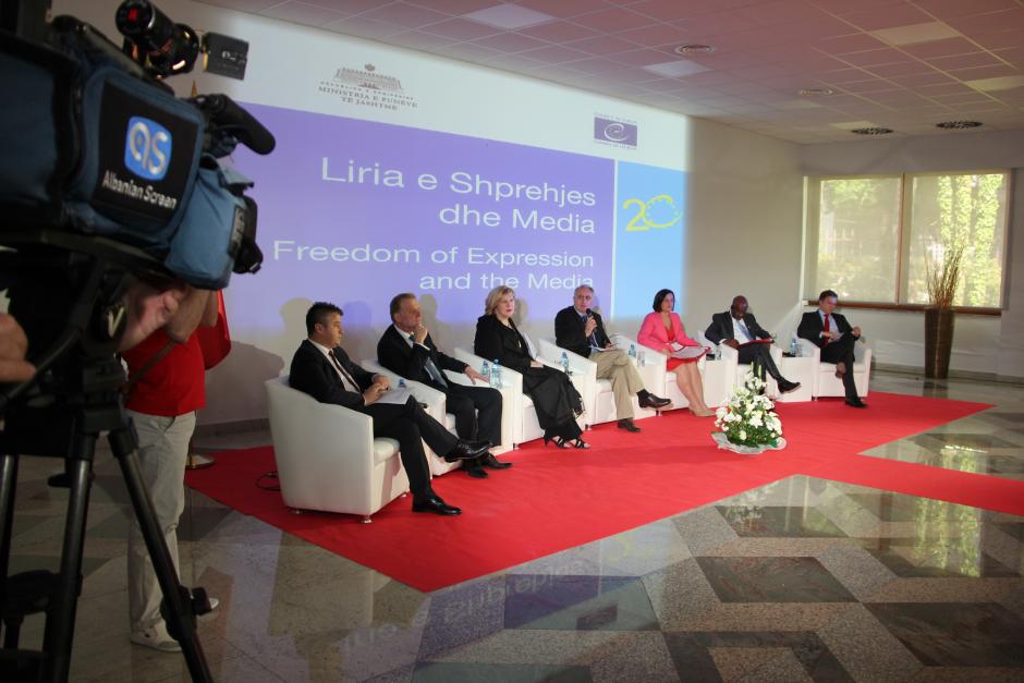 The OSCE Representative on Freedom of the Media, Dunja Mijatović (3rd from left), participating in a media freedom conference commemorating 20 years of Albania's membership in the Council of Europe, 11 June 2015.