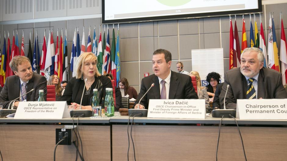 (L-r) Andrey Rikther, Director of the Office of the OSCE Representative on Freedom of the Media; OSCE Representative on Freedom of the Media Dunja Mijatović; OSCE Chairperson-in-Office and Serbia’s Foreign Minister Ivica Dačić; Ambassador Vuk Zugic, Permanent Representative of the Republic of Serbia to the OSCE, at the closing plenary session at the conference Journalists’ Safety, Media Freedom and Pluralism in Times of Conflict, 16 June 2015.