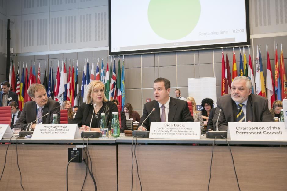 (L-R) Andrey Rikther, Director of the Office of the OSCE Representative on Freedom of the Media; OSCE Representative on Freedom of the Media Dunja Mijatović; OSCE Chairperson-in-Office and Serbia’s Foreign Minister Ivica Dačić; Ambassador Vuk Zugic, Permanent Representative of the Republic of Serbia to the OSCE, at the closing plenary session at the conference Journalists’ Safety, Media Freedom and Pluralism in Times of Conflict, Vienna, 16 June 2015.
