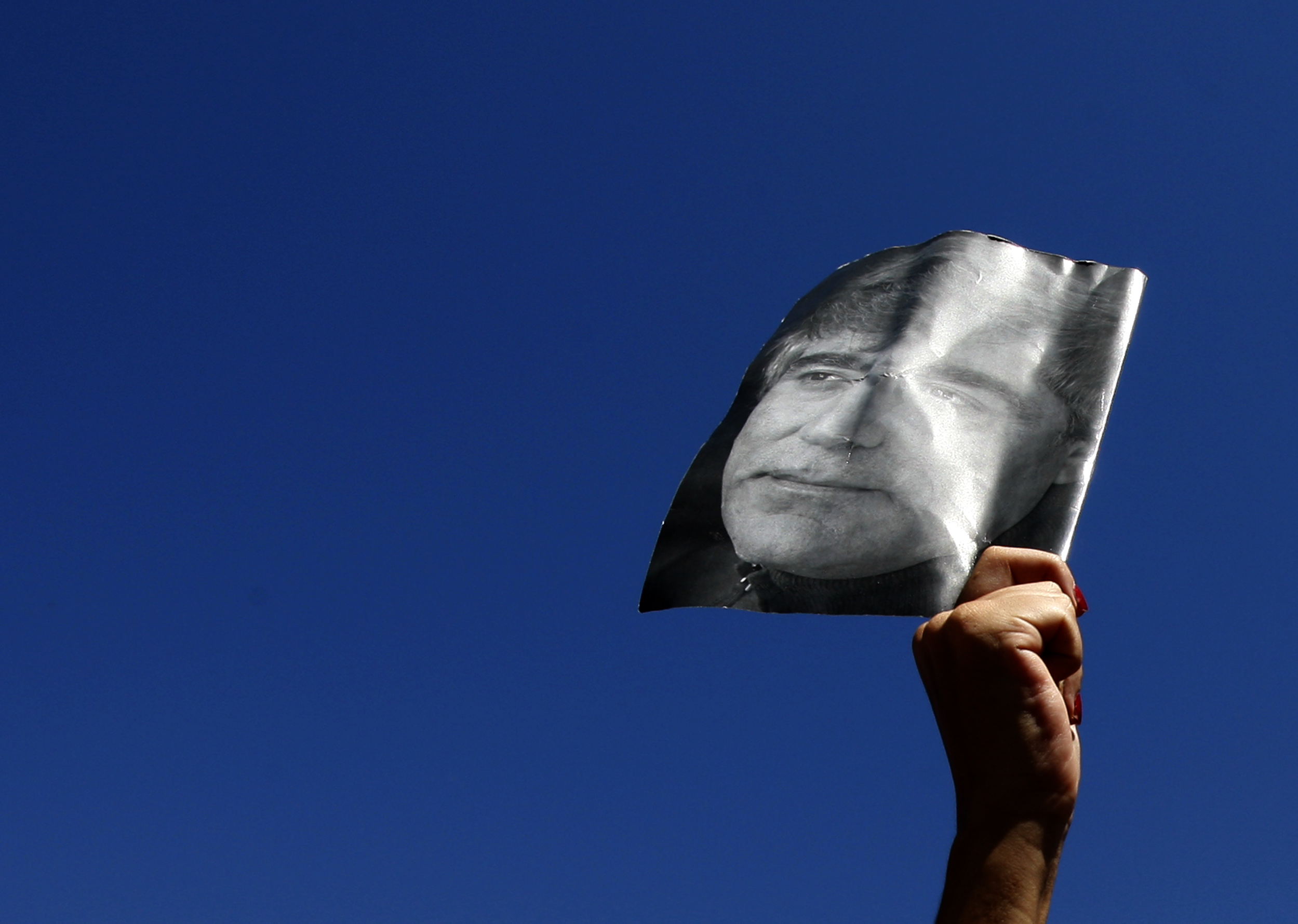A demonstrator holds up a portrait of the late Turkish-Armenian writer Hrant Dink in Istanbul, 7 July 2008.