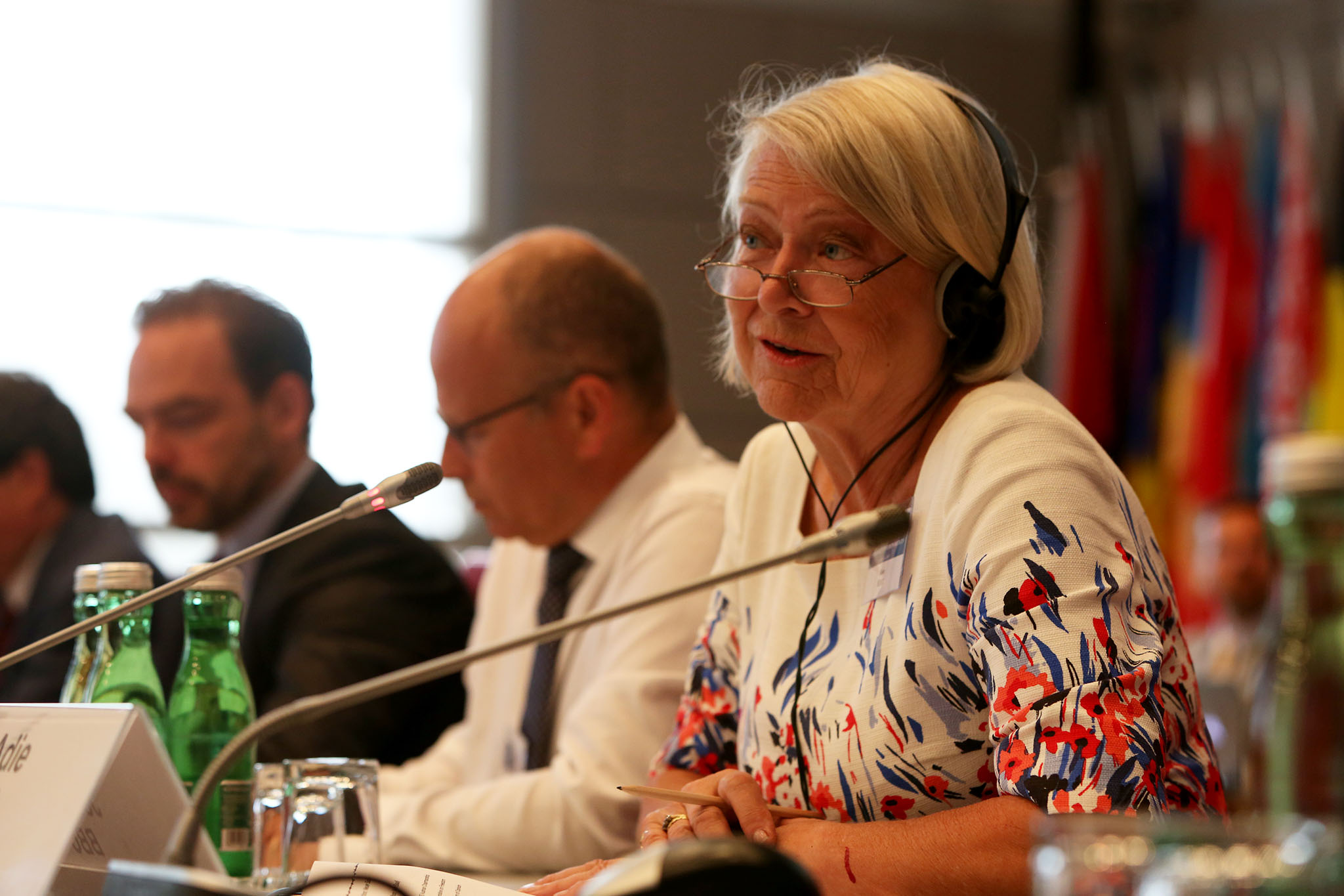 Kate Adie, BBC journalist, delivering her keynote speech at the conference Media freedom in volatile environments, Vienna, 19 June 2017.