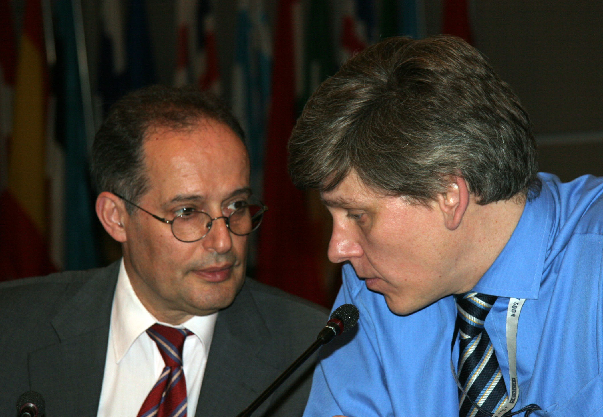 Miklos Haraszti (left), the OSCE Representative on Freedom of the Media, speaks with the Director of his Office, Roland Bless, at a media conference in Vienna, 13 July 2006.