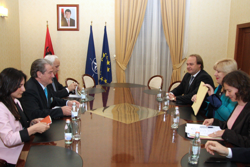 Albanian Prime Minister Sali Berisha (second from left) and his advisers meet for talks with, from right, OSCE Representative on Freedom of the Media Senior Adviser Ženet Mujić, OSCE Representative on Freedom of the Media Dunja Mijatović, and Head of the OSCE Presence in Albania Ambassador Eugen Wollfarth, Tirana, 7 June 2012.