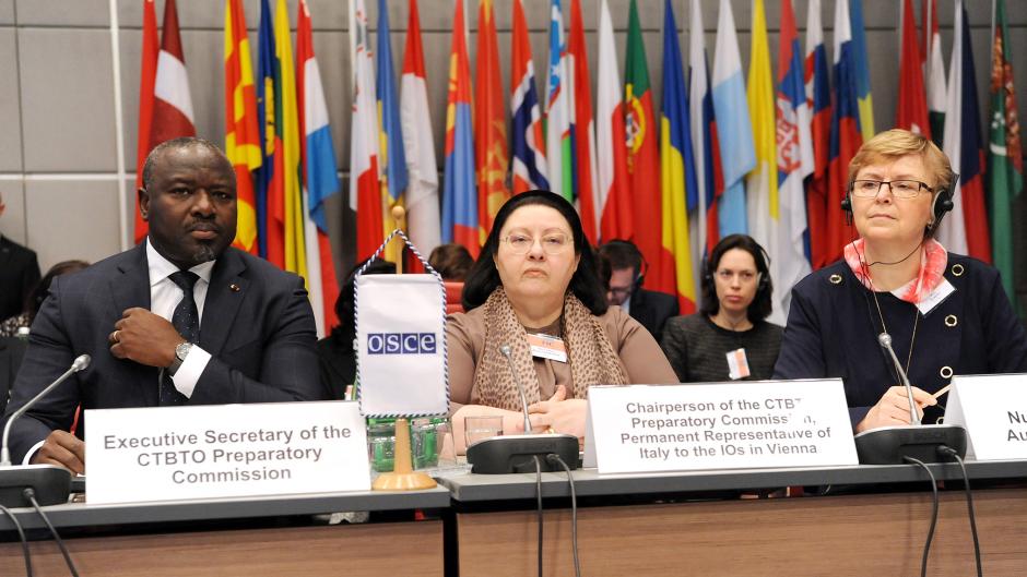 Dr. Lassina Zerbo (l-r), Executive Secretary of the Preparatory Commission for the Comprehensive Nuclear-Test-Ban Treaty Organization (CTBTO), H. E. Ambassador Maria Assunta Accili Sabbatini, Chairperson of the CTBTO Preparatory Commission, and Marta Žiaková, Chairperson of the Nuclear Regulatory Authority of Slovakia at the meeting of the Forum for Security Co-operation, Vienna, 7 February 2018.