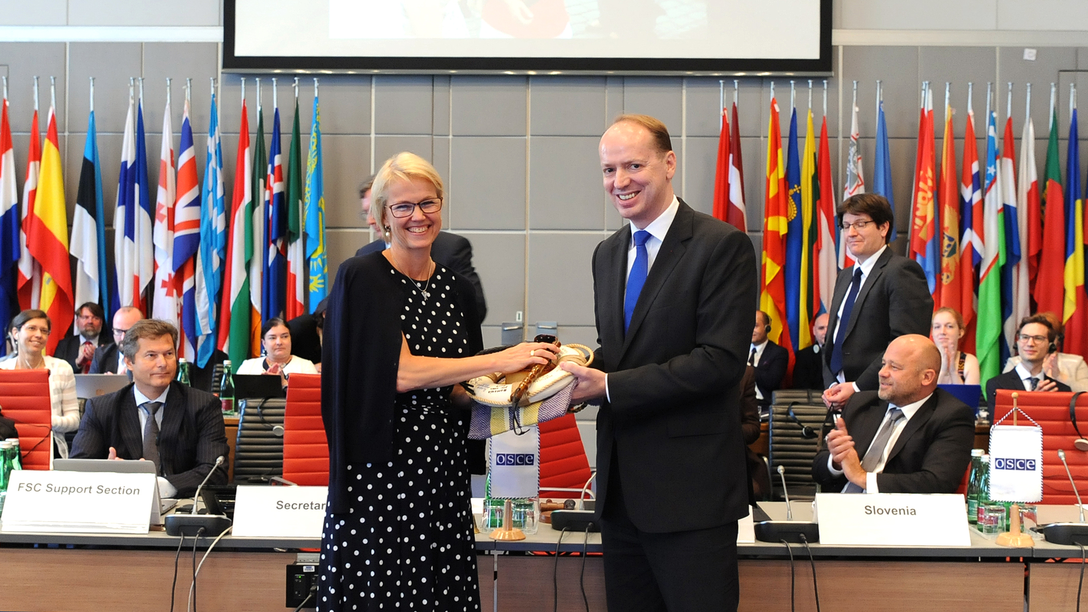 Permanent Representative of Slovenia to the OSCE and outgoing Chairperson of the Forum for Security Co-operation (FSC) Ambassador Andrej Benedejčič (r) hands over the FSC insignia to incoming Chairperson Ambassador Ulrika Funered of Sweden, Vienna, 18 July 2018.