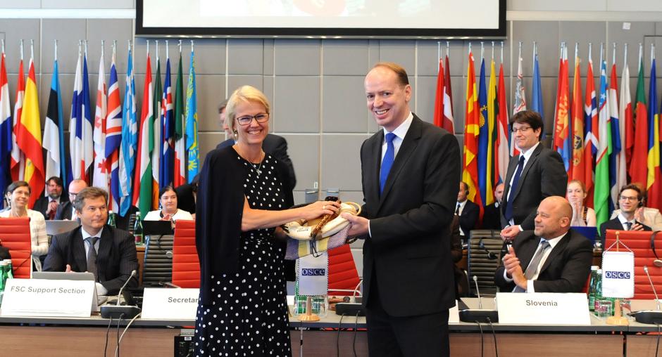 Presenting the insignia of the FSC Chair to his successor, Ambassador Ulrika Funered of Sweden, Benedejčič assured her of Slovenia’s full support during the upcoming Swedish FSC Chairmanship later this year.
