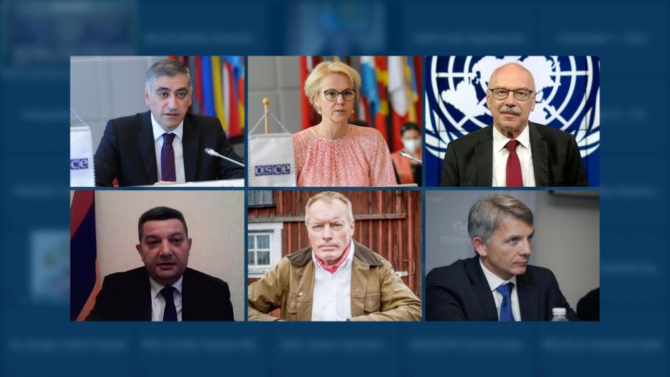(l-r) Armen Papikyan, Permanent Representative of the Republic of Armenia to the OSCE and Chair of the OSCE Forum for Security Co-operation (FSC); Ulrika Funered, Permanent Representative of Sweden to the OSCE, Chairperson of the OSCE Permanent Council; Vladimir Voronkov, Under-Secretary-General United Nations Office of Counter-Terrorism; Magnus Norell, Adjunct Scholar at the Washington Institute for Near East Policy and Senior Fellow at the European Foundation for Democracy; Hrant Aghasaryan, National Security Service, Republic of Armenia; Éric Denécé, Director of the French Centre for Intelligence Studies at the joint meeting of the OSCE Forum for Security Co-operation (FSC) and OSCE Permanent Council, 14 July 2021.
