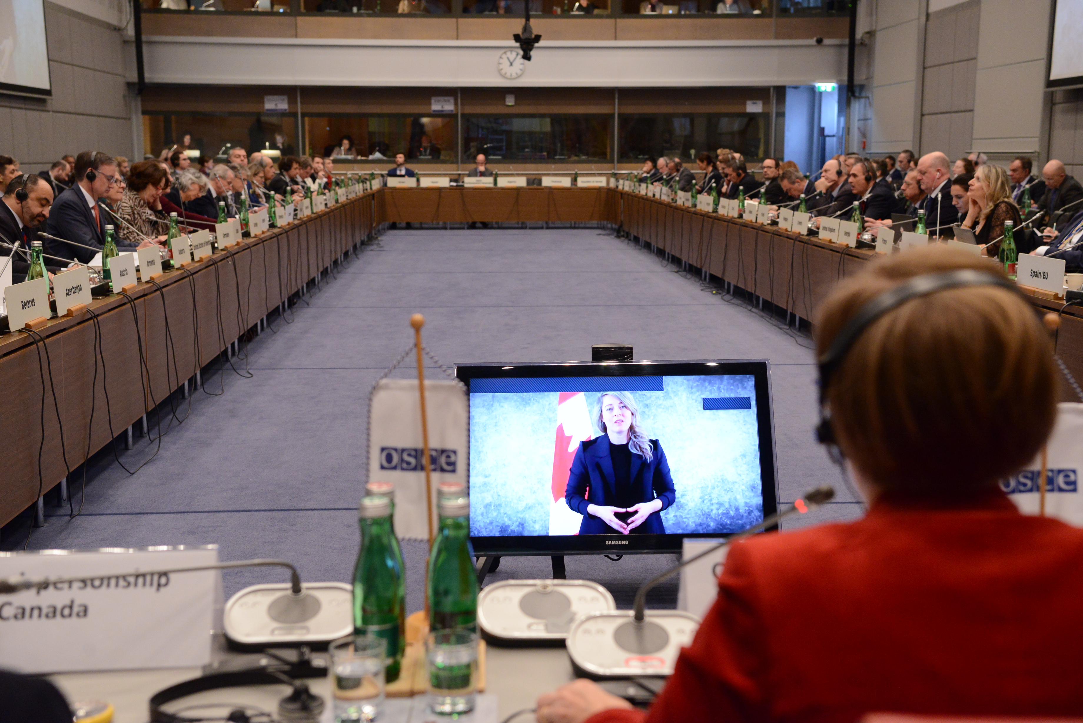 Participants at Canada's closing plenary meeting of the OSCE’s Forum for Security Co-operation listening to the message from Canada’s Minister of Foreign Affairs Mélanie Joly, Vienna, 13 December 2023.