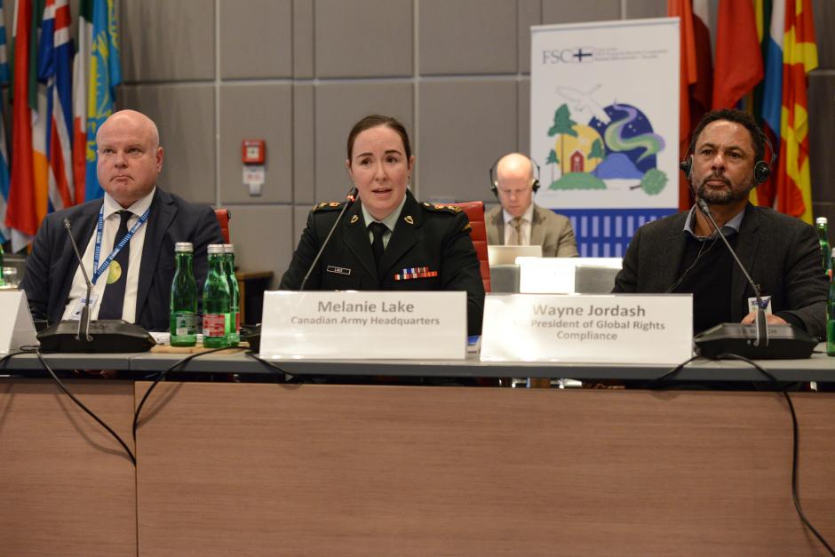 Chairperson Vesa Häkkinen, Ambassador and Permanent Representative of Finnland to the OSCE (left) with panelists at the Forum for Security Co-operation (FSC) side event on Sexual and Gender-Based Violence as a Weapon of War, Vienna, 13 November 2025.