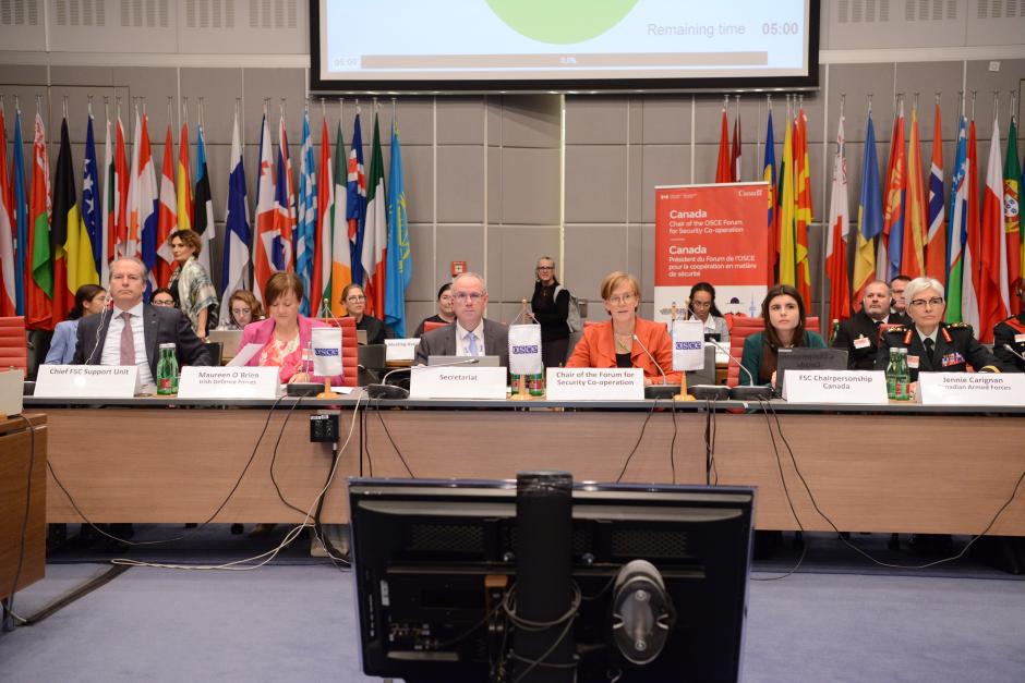 Participants au dialogue sur la sécurité consacré à la résolution 1325+ du Conseil de sécurité des Nations unies et à l'agenda femmes, paix et sécurité, organisé par la présidence canadienne du Forum pour la coopération en matière de sécurité (FCS), Vienne, 25 octobre 2023.